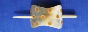 Aus Indien: Haarspange aus polierten Rinderhorn, (Färbungen weichen naturbedingt voneinander ab). Länge (ohne Stab): ca. 6,5 cm, Breite: ca. 4,5 cm, Max. Abstand zwischen Stab und Spange: ca. 1,2 cm, Stab ist ca. 12,5 bis 14,5 cm lang