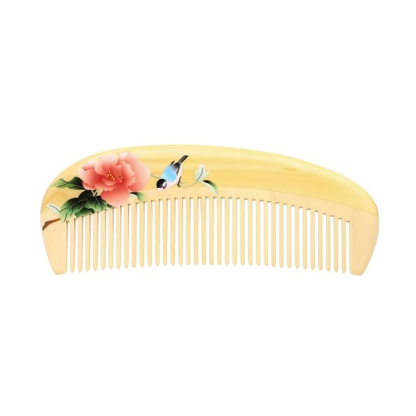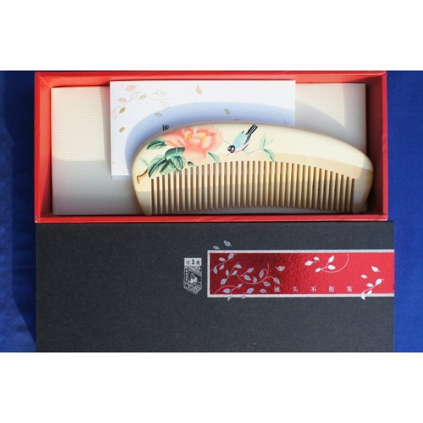 poliertes Buchsbaumholz, handbemalt und gewachst, Länge 13 cm, Zahnabstand 1,4 mm. In ansprechender Geschenkbox und kleinem Seidenbeutel.