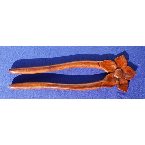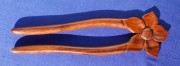 Handgefertigte Haarforke aus rotbraunem Pao Rosa, mit beidseitigem Blütenmuster, gewachst, Länge 13,5 cm.