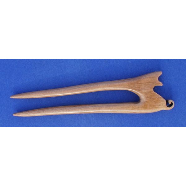 Handgefertigte, kurze Haarforke aus hellbraunem Pfirsichbaumholz, lackiert, Länge 12,5 cm.