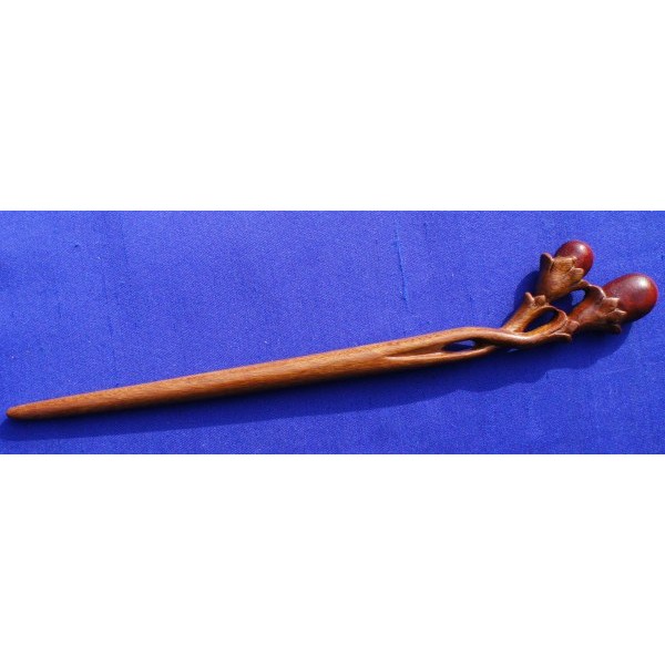Geschnitzte Haarnadel aus orangebraunem Rosenholz mit Einsätzen aus Pao Rosa, lackiert, Länge 19 cm