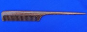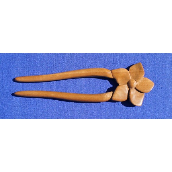 Handgefertigte Haarforke aus rotbraunem Pfirsichbaumholz, mit beidseitigem Blütenmuster, lackiert, Länge 13,5 cm.