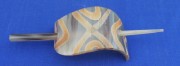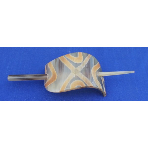 Aus Indien: Haarspange aus polierten Rinderhorn mit eingebrannten Muster, (Musterung und Färbung weichen naturbedingt voneinander ab). Länge (ohne Stab): ca. 6 cm, Breite: ca. 4 cm, Max. Abstand zwischen Stab und Spange: ca. 1 cm (kleiner als bei den anderen Modellen), (Stab ist ca. 12,5 bis 14,5 cm lang