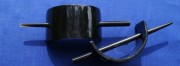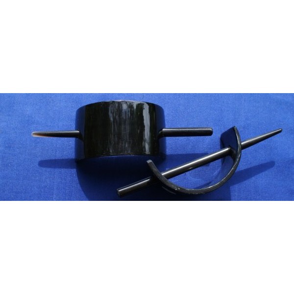 Aus Indien: Haarspange aus polierten schwarzem Büffelhorn, Länge (ohne Stab): ca. 7 cm, Breite: ca. 3,8 cm, Max. Abstand zwischen Stab und Spange: ca. 1,5 cm , Stab ist ca. 12,5 bis 14,5 cm lang
