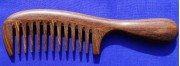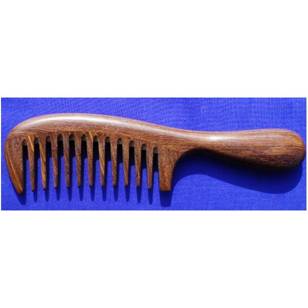 braun gemasertes Panga Panga Holz mit glatt polierter Oberfläche, dicklicher Griff liegt sehr bequem in der Hand, ausgesägter Zahngrund, Länge 20 cm, Zahnabstand 4-5 mm.