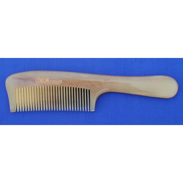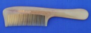 einfach verarbeiteter aber stabil dicker Griffkamm aus bernsteinfarbenen Schafshorn teilweise mit leichter, rötlicher Maserung, Zahnabstand: 1,5 mm, Länge 20 cm (Verarbeitung ist schlichter als bei den anderen Modellen, die Zahninnenseite eher rauh)