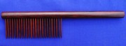 mit eingesetzten Zahnblättern wie bei einem normalen Kamm und deshalb stabiler als runde Stifte. Grifftück ist ein langer runder Stiiel aus rötlichen Pao Rosa, zum Schutz der Oberfläche gewachst, Länge 22 cm, Zahnabstand 2 mm