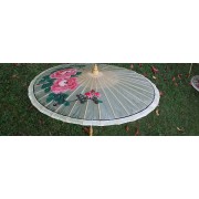 painted by chinese artist, made of bamboo and oiled paper, so it can endure some rain but it is not for daily use of course. Length (handle): 58 cm, diameter (umbrella): ~ 100 cm